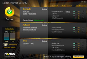 Dengan desain berjenis sama seperti versi sebelumnya, NIS 2010 menampilaan Norton Task, dengan kinerja CPU dan 'konsumsi' kinerja oleh Norton nampak di sisi sebelah kiri aplikasi. Pengguna pun dapat mengetahui kinerja taskbar secara lebih detail di dalamnya. Selain itu, Norton masih memiliki fitur Norton Insight yang disebut Application Ratings. Aplikasi ini mengidentifikasi file yang bekerja pada sistem dan 'dipercaya' Norton dalam kondisi aman, tanpa melakukan scan terlebih dahulu.
